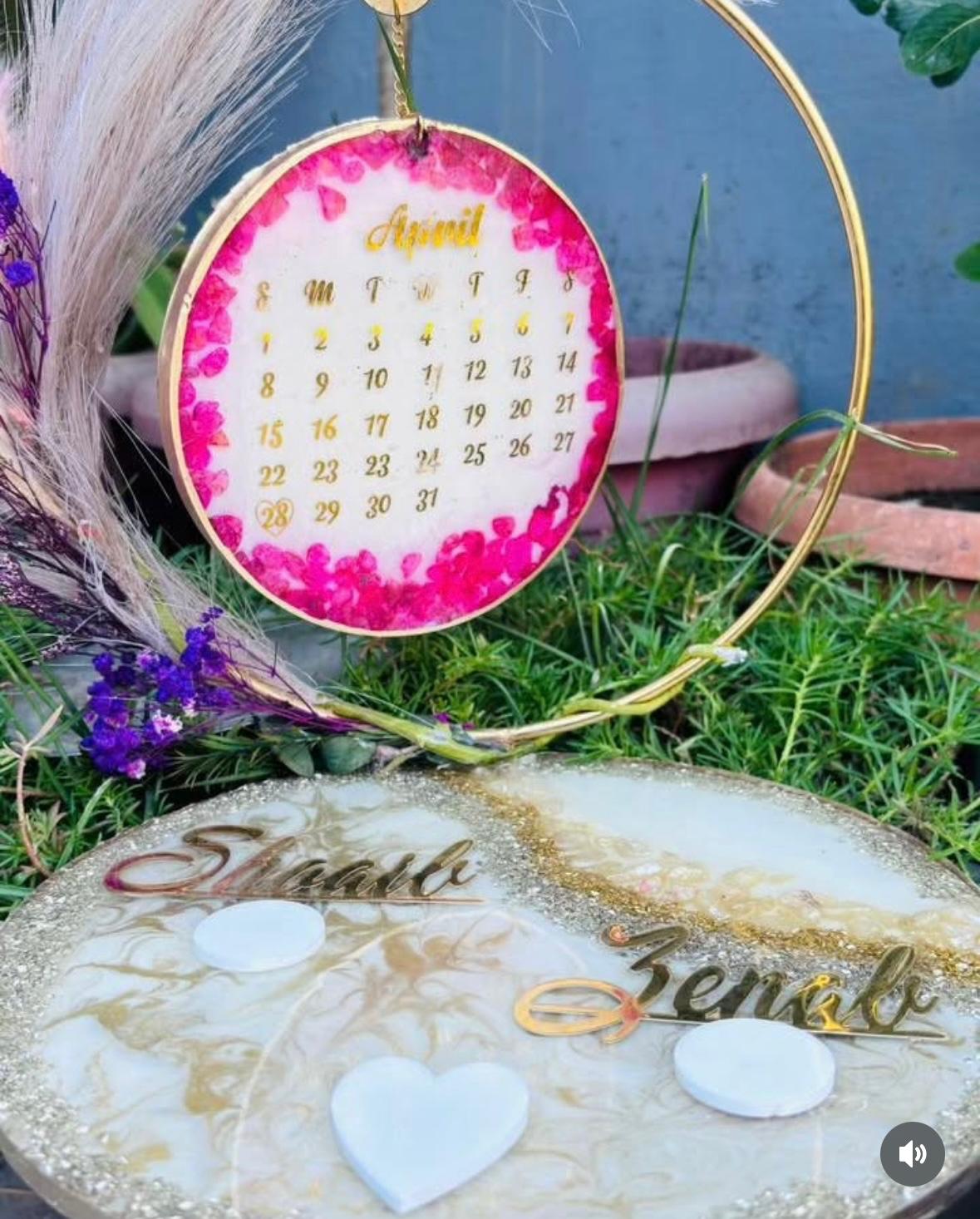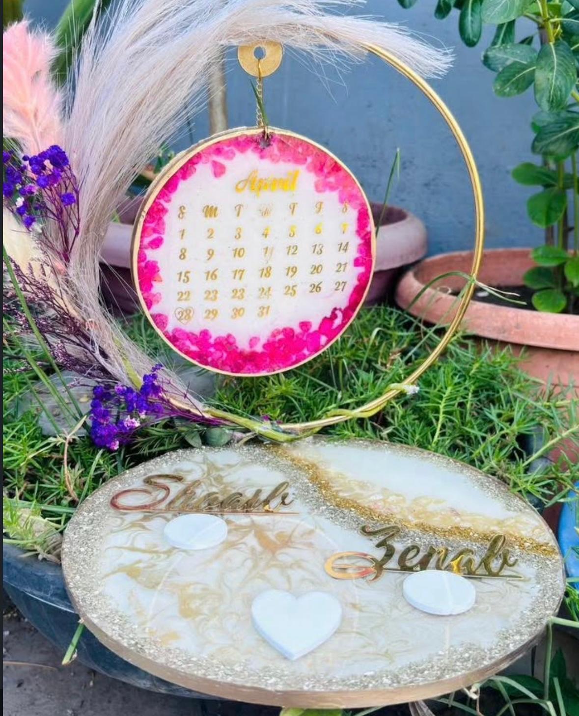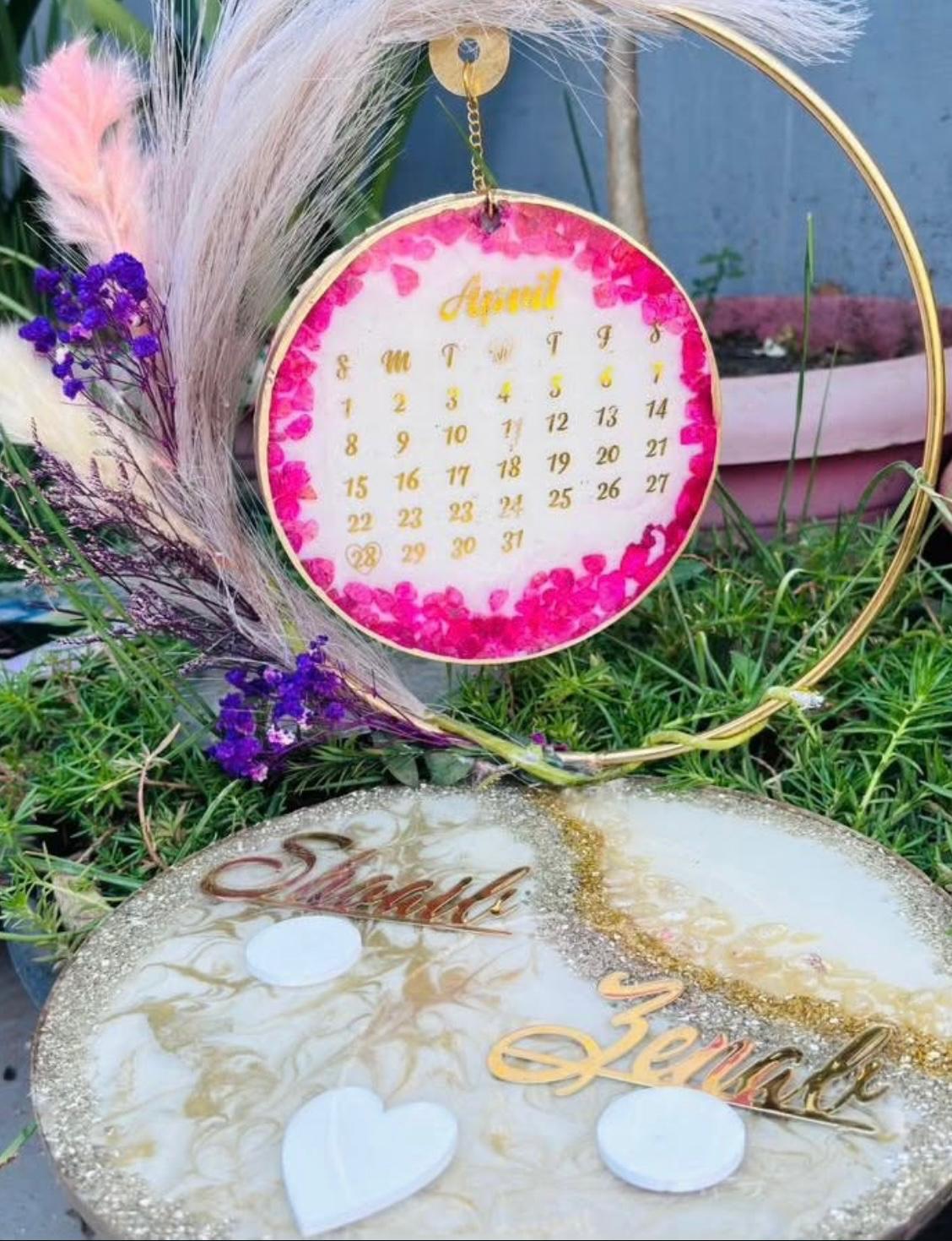 A round resin disc displays a monthly calendar (shown here for April), with delicate golden lettering and floral accents. The date that marks your special moment is subtly emphasized, turning a regular calendar into a cherished memory.
