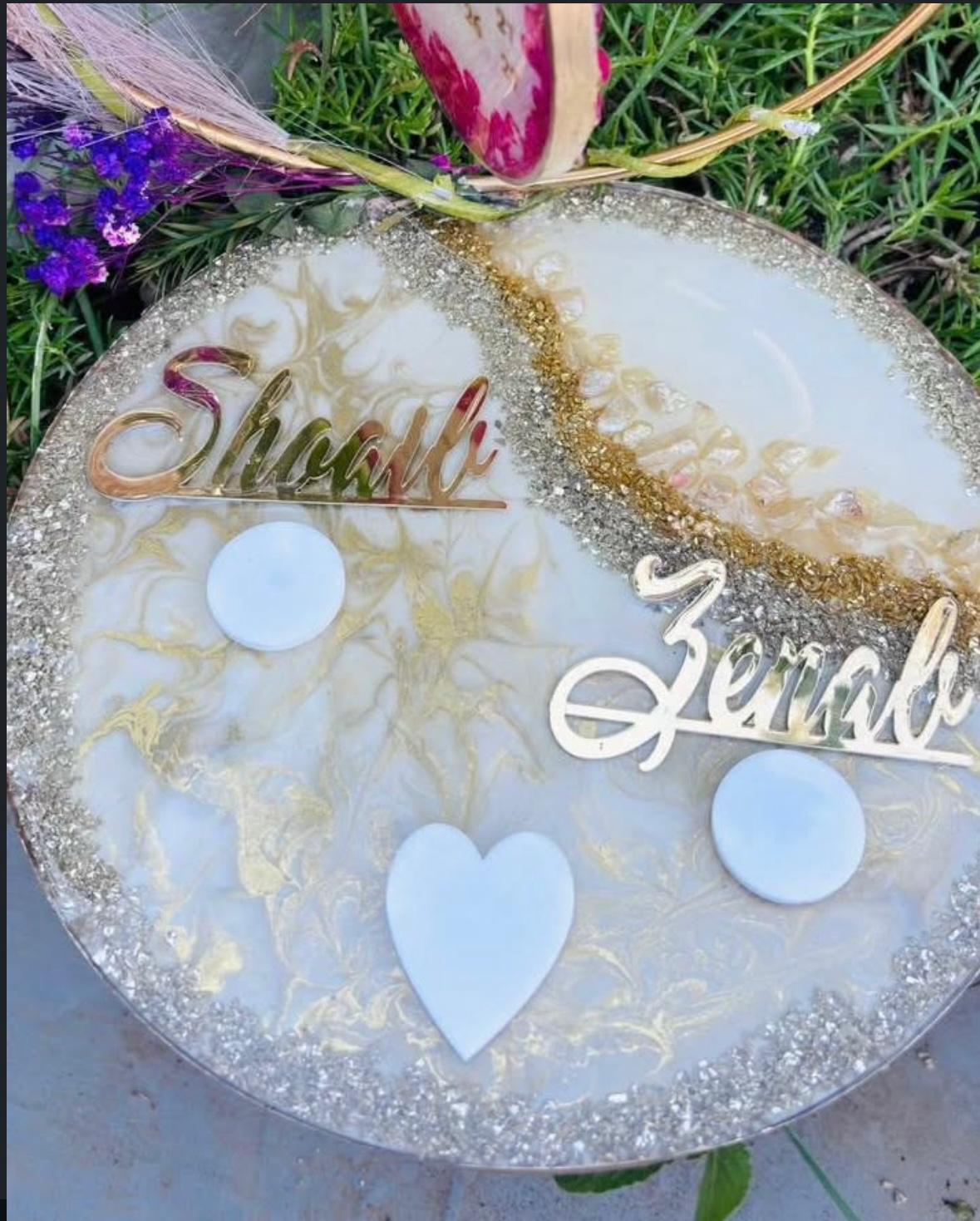 The base features glossy resin art in marbled beige and gold, adorned with sparkling glitter and raised acrylic white hearts. The couple's names ā Saurabh and Zenaki in this design ā are stylishly embedded in golden and bronze script.